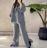قسمت پایین شلوار دارای شکاف ترندی بوده که پا رو کشیده تر نشون میده و با کتونی های اسپرت بسیار جذاب ست میشه. آستین ها کمی آزاد و افتاده طراحی شده تا حس راحتی کامل رو ایجاد کنه.